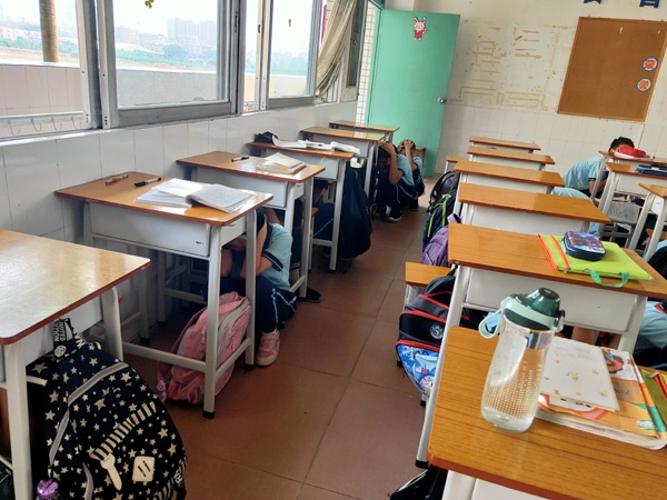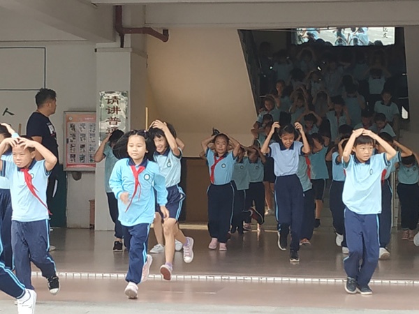 下午4時(shí)演練活動(dòng)正式開始,演練主持通過廣播向全體師生講述本次演練的實(shí)際意義、注意事項(xiàng)及相關(guān)要求。隨后,通過廣播緊急通知學(xué)校發(fā)生地震,請(qǐng)全體師生緊急躲避。各師生立即抱頭躲避,直至廣播提示地震已經(jīng)停止才開始從課室往疏散點(diǎn)進(jìn)行撤離。此外,疏散引導(dǎo)組的老師在相應(yīng)樓梯口位置緊引導(dǎo)學(xué)生做好避險(xiǎn)和疏散。全校師生順利集中到操場(chǎng)的疏散點(diǎn)后,各班以班級(jí)為單位集隊(duì)并立即清點(diǎn)人數(shù),將人數(shù)向黃健翼和陳海輝老師報(bào)告。最后,黃老師向陳子兵副校長(zhǎng)匯報(bào):本次演練應(yīng)到人數(shù)全部順利地疏散到安全地點(diǎn)。