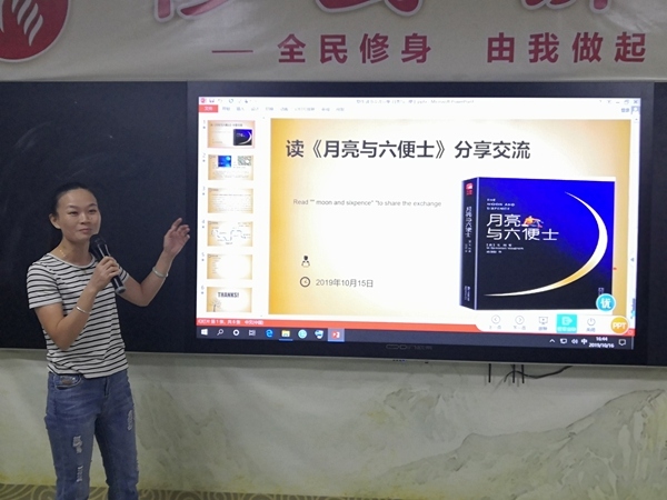 緊接著第二位分享讀書的是王忠美老師。王老師分享了英國小說家威廉· 薩默賽特·毛姆的創(chuàng)作的長篇小說《月亮和六便士》。王老師簡述故事內(nèi)容,通過斯特里克蘭的故事經(jīng)歷,聯(lián)系自身的教學(xué)經(jīng)驗總結(jié)出:如果我們的學(xué)生有自己的愛好和興趣,我們可以把他的愛好和興趣作為他們的軟柿子,捏在手里,以此提高孩子的主動性。而且,孩子的興趣愛好可能會成為教育上某個成功點。通過斯特洛夫這個人物形象,王老師得出:我們教育者都應(yīng)該教育出向善的人,教育孩子追求理想的同時,不管受多大挫折,都是以幫助別人為樂。