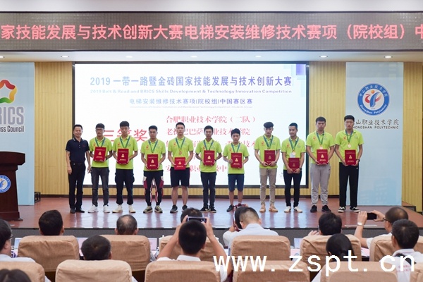 9月27日,“2019一帶一路暨金磚國家技能發展與技術創新大賽電梯安裝維修技術賽項(院校組)中國賽區賽”在中山職院遂賢廳順利閉幕。經過激烈比拼,由該校機電工程學院賀德明、翟永全兩位老師指導,李杰松、盧誠嵐同學組成的學校一隊憑借出色發揮,喜獲大賽一等獎;由王青、童中春老師指導的二隊,鄧發兆、列海凡同學獲三等獎;賀德明、翟永全獲評優秀指導教師。