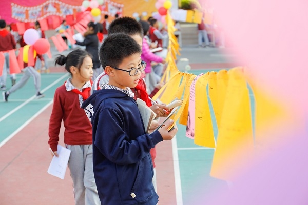 這次游園活動的方案教導處20天前就已公布,各位老師按方案有條不紊地進行準備。共有5個園區,游園項目的設置在去年基礎上有所增加,具有鮮明的年段特點。猜字謎、對春聯、填詩詞、背經典、數青蛙、搭七巧板、趣味成語、生活與數學、英語完形填空……30多個游藝宮精彩紛呈。上午所有題目已掛好,并有一簇簇氣球裝飾。兩點整,各班學生拿著活動記錄單和筆進入游藝區,一、二年級園區在香樟園,有10個班的同學參與;三、四年級園區在羽毛球場,高年級園區在階梯室側面的鳳凰廣場。新增的“踢毽子”項目吸引了很多男孩子,趙老師一邊指導動作,一邊鼓勵他們多玩幾輪。不一會兒,負責對答案的“宮主”前排起了長龍。有的同學很有策略,專門在自己擅長的某個項目排隊答題。有的在“趣味撲克”那兒冥思苦想;有的搖頭晃腦數青蛙;有的胸有成竹地背出古詩文或對出下聯;有的同學猜出很難的成語,得到“宮主”夸獎眉飛色舞;有些兩兩合作,一下子答出題目要求的六個成語滿意離開;有的因為所選題號已被人答過稍顯遺憾隨即又投入“戰斗”……