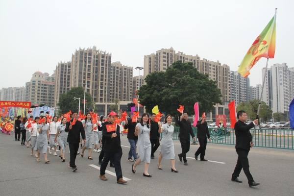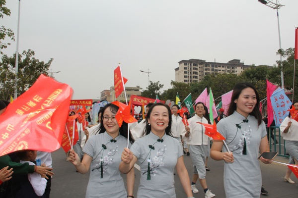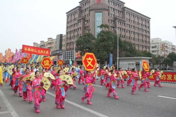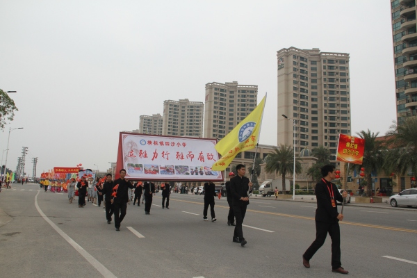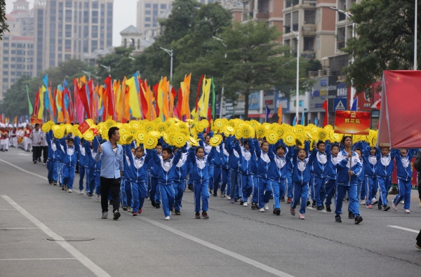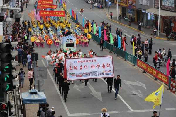 看,四沙小學方陣來了!緊跟著校旗的,是“立雅力行,雅而有致”大幅標語牌,后面是教師方陣。教師方陣里,男老師身穿黑色中山裝,穩重大方;女老師穿著淺色旗袍,飄逸典雅。學生方陣在老師的后面。學生前面,是一輛花車。花車上,該校雅行教育吉祥物文文和雅雅不斷地巡游的人及周邊的群眾揮手致意。學生們身穿京劇服裝和古裝漢服,高舉“文雅、儒雅、和雅”等大字,一邊走一邊高呼:“文雅立行,雅而有致”。家長方陣走在最后。家長方陣彩旗獵獵。“文雅學生 陽光成長”、“儒雅教師 立德樹人”、“雅行課程 情趣飛揚”等彩旗隨風招展,襯著家長們的黃色上衣特別耀眼。該校方陣走到哪里,哪里就是一道亮麗的風景線。