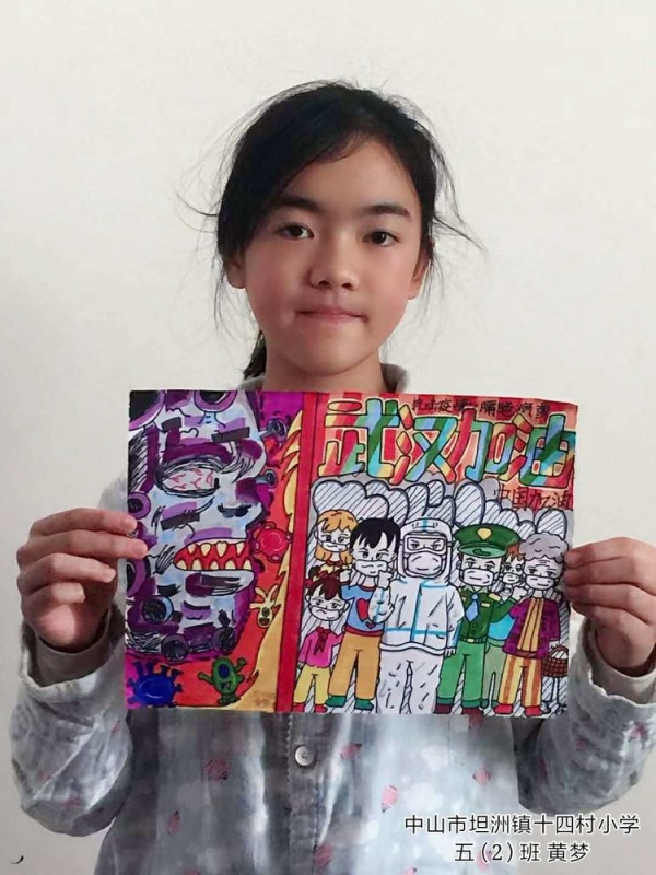 2020年1月22日起,中山市坦洲鎮十四村小學全體師生在這個疫情爆發的特殊時期,每天按時做好自己和家人的健康監測,同時心系我親愛的祖國,心系疫區的同胞們,美術老師王洪悅在線指導學生創作繪畫,“中國加油,武漢加油,抗疫繪畫”創作,雖然時處寒假,也不能夠阻擋老師學生家長的愛國熱情,雖然有些孩子年級尚小還有些懵懂,但老師們竭盡所能以這種教育的形式講述給孩子們,引導孩子們向每一個挺身而出的人致敬,增強他們對生命意義的再認知。2020年2月8日,十四村小學孩子們呈現了一幅幅栩栩如生并包含濃濃地愛國情懷的美術作品。
