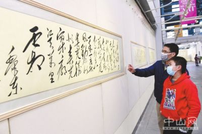 1月1日上午,由市文化廣電旅游局主辦的“新的征程——黑子、陽子毛體書風(fēng)中山展”在中山美術(shù)館拉開序幕,展覽將持續(xù)至1月5日,市民可免費觀展。市委常委、宣傳部部長林銳熙出席開幕儀式。圖為家長向孩子講解書法中的含義。