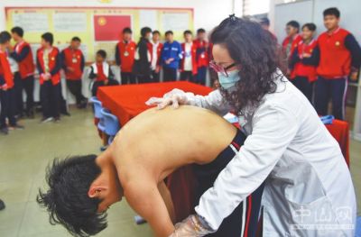 專業的篩查人員對學生的雙肩、雙肩胛骨、軀干雙側輪廓、骨盆的對稱性檢查及脊柱觸診,并進行Adam彎腰試驗檢查。一位剛從檢查室里出來的9年級學生說,這已是自己第3年接受脊柱健康篩查。學校負責人表示,篩查人員對檢查中發現學生脊柱疑似側彎的,都會進行登記并發書面通知給家長,建議帶孩子到市中小學衛生保健所進行復診。學校近年為了學生的脊柱健康,也陸續更換了部分桌椅。采用可調節高低的新款式桌椅,方便了不同身高學生的使用,也為脊柱健康做好保障。