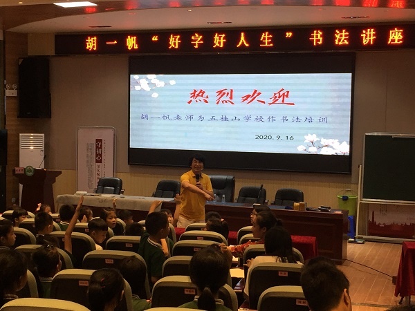 9月16下午,深圳書畫家協會副秘書長、寫字教育專家胡一帆老師蒞臨五桂山學校,對全校師生代表進行書法培訓。學校負責人陳玉玲、全體語文老師,各班學生代表、家長代表共計200余人參加此次培訓。