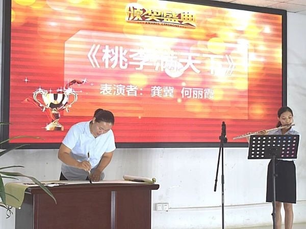 隨著一曲《掌聲響起來》,把大家帶到了最讓人滿心期待,動人心弦的頒獎環節。桂南學校對1名市級師德標兵、2名市級優秀教師、1名區級優秀教育工作者、7名校級優秀班主任、40名校級優秀教師、7名校級優秀員工進行逐一表彰,并頒發了證書和獎金;還對今年中考工作中做出貢獻的16名教師頒發豐厚的獎金,希望通過表彰的方式,讓廣大教師能夠恪盡職守、刻苦專研,努力成為新時代合格教師。同時還對在桂南學校工作滿五年、十年、十五年的教師頒發紀念杯和純金紀念幣,讓所有老師都能感受到家的溫暖,在今后的生活和工作中更加有歸屬感和幸福感。晚會還穿插了現場書法、長笛演奏、詩歌朗誦等豐富多彩的文藝節目,給整個晚會增添了不一樣的色彩,整個現場氣氛融洽,高潮迭起,笑聲不斷。