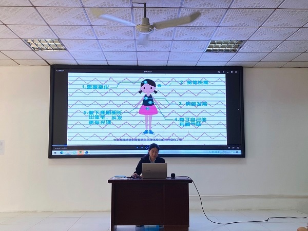活動的開篇,張主任播放了一個有關做自信女孩的短片,借此告訴女生們要敢于表現自己,對自己要充滿自信。隨后張主任從“花季青春期”的種種表現入手,激發學生的求知欲,進而切入到“青春期女生的身體會發生哪些變化”的相關知識。在學生對青春期生理的變化有了一定的了解后,張主任又給學生講解如何護理、如何選用衛生巾等一些月經期護理的必要常識。通過一系列青春期知識的講授,女生們對青春期有了更深入的了解,對青春期所發生的種種變化不再迷茫,并且學會自我保護。