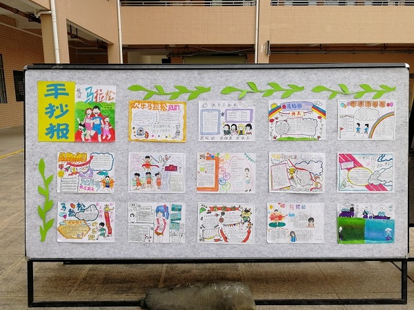 活動當天,學校還同步舉辦了馬拉松文化系列展。同學們用書法、思維導圖和手抄報等形式表達對馬拉松的熱愛與向往。校道兩旁邊的“跑馬”宣傳欄與馬拉松文化展營造了濃郁的“跑馬”氛圍。