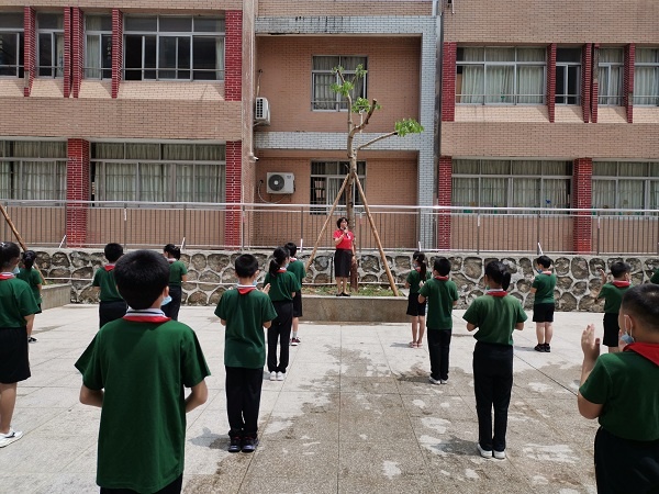 開學第一課結束后,學校為孩子們舉行了簡單而又隆重的開學典禮。學校負責人陳玉玲副校長要求學生不要忘記一直在身后默默保護著我們的醫護人員、抗疫戰士們,勉勵同學們把失去的時間搶回來,把落下的課程補回來。