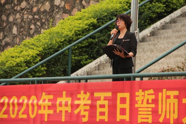 大會在莊嚴的國歌聲中拉開了序幕。學校負責人陳玉玲在國旗下做了語重心長而又振奮人心的講話。她首先從為什么要讀書講起,讓同學們明白讀書是為了求知,知識能改變生活,讀書就是為了能在國家需要我們的時候,我們有能力、有責任挺身而出。她鼓勵九年級全體師生以高昂的斗志,百倍的信心,堅定的意志,全身心地備戰中考。陳校長睿智親切的話語,讓師生們感受到學校領導的關懷與期待。