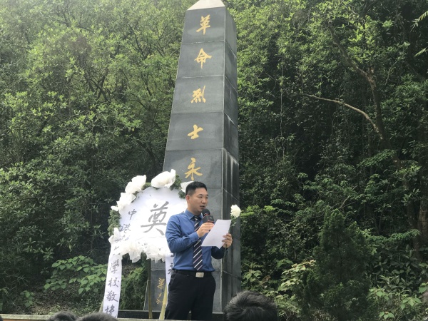 活動現場,在校團支部書記劉穎老師的帶領下,四名學生代表向烈士墓敬獻花圈,以表達他們對革命先烈的崇敬和懷念之情。在莊嚴肅穆的氣氛中,全體師生在革命烈士紀念碑前整齊列隊,全體人員低頭默哀一分鐘,以示對烈士最崇高的敬意。五桂山學校周慶基老校長向同學們介紹了當地紀念碑的由來以及“五·九”反掃蕩戰斗中革命先烈的英雄事跡。F.5D林校綺同學作為學生團員代表發言。她表示要學習革命先烈的精神,繼承先烈的遺志,發揚光榮的革命傳統,規范自己的言行,嚴格要求自己,好好學習,為振興中華,建設強大的祖國而努力,以告慰烈士忠魂。