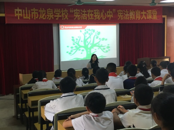 為深入貫徹落實黨的十九大精神,維護憲法權威,進一步加深學生對國家憲法的了解,培養(yǎng)學生樹立遵守憲法的意識,從小學法、懂法、守法。中山市龍泉學校于5月22日、23日邀請了廣東君品律師事務所竇倩倩律師給全體師生開展了以“憲法在我心中”憲法教育專題講座。