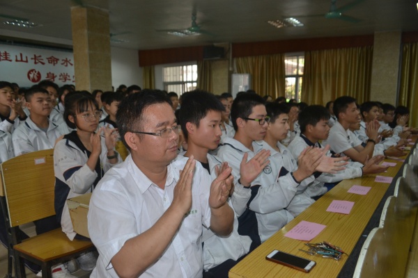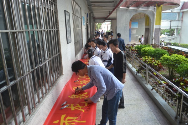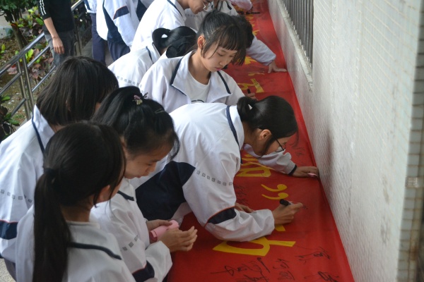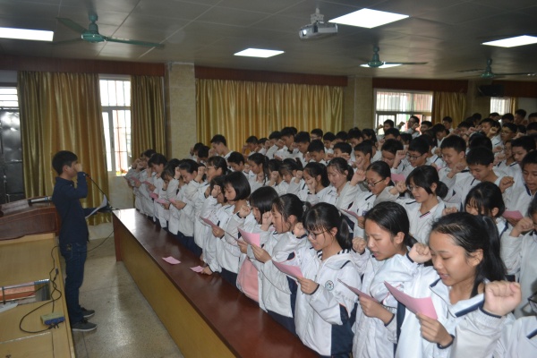 激動人心的時刻來了,九年級全體教師走上臺前,魏賽彬老師率領同學們宣誓和簽名。同學們喊出擲地有聲的誓言,抒發勇于拼搏,敢于挑戰的勇氣和豪情,堅定了必勝的信念,激發了催人奮進的斗志,把誓師大會推向高潮。?