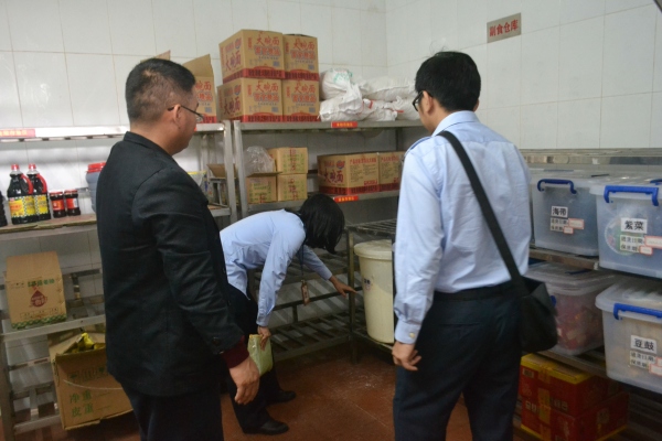 檢查組一行在黃飛躍校長(zhǎng)、李志雄主任等行政的陪同下深入學(xué)校食堂,查看了食堂環(huán)境、餐飲服務(wù)許可證、從業(yè)人員健康證、食品原料的采購(gòu)記錄及相關(guān)制度等內(nèi)容進(jìn)行了檢查。接著檢查組一行還檢查了校園公共環(huán)境衛(wèi)生、傳染病預(yù)防等內(nèi)容進(jìn)行了全面檢查指導(dǎo)。