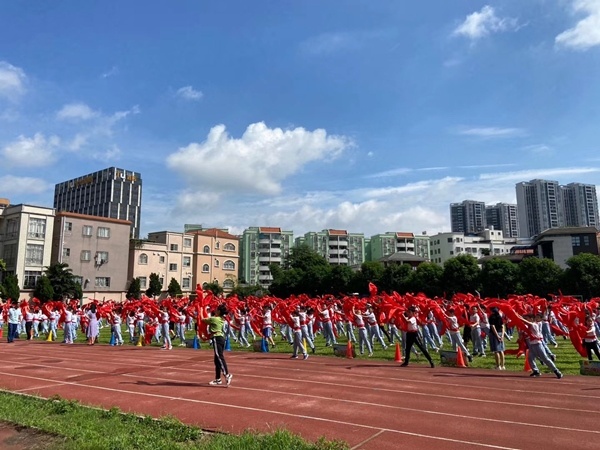 為了讓學(xué)生們進(jìn)一步地了解感受水滸人物的獨(dú)特魅力,增強(qiáng)自身身體素質(zhì),北區(qū)小學(xué)經(jīng)過研究討論,用《好漢歌》編排了一套活力滿滿,動(dòng)感十足的校本操,搭配著節(jié)奏感非常強(qiáng)烈的歌曲,學(xué)生跳起來動(dòng)感、精神。在動(dòng)感、豪爽的步子中舞起腰間的紅綢帶,顫步晃頭,扭腰抖肩。整體動(dòng)作爽朗風(fēng)趣、活潑大方。搭配上熱情豪邁的《好漢歌》,既能感受到水滸英雄的疏朗豪情,又能很好地鍛煉身體,每日大課間鈴聲響起時(shí),他們便會(huì)迫不及待地拿出屬于自己的紅綢帶,迅速地排好隊(duì)集中在操場(chǎng)上,跟隨著彭靜老師的口令學(xué)習(xí)集體舞動(dòng)作。驕陽如火,孩子們手中的紅綢舞動(dòng)起來,連成一片紅色的海洋。