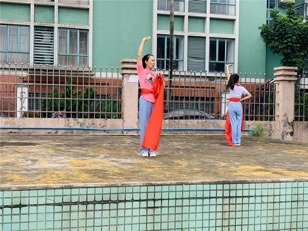 每個(gè)孩子的臉上都洋溢著燦爛的笑容,高年級(jí)的小朋友們學(xué)得快一些,動(dòng)作有模有樣,踩著鼓點(diǎn)變化著腳步,揚(yáng)起紅綢;低年級(jí)的弟弟妹妹們學(xué)得稍微慢一些,但跟著哥哥姐姐們搖擺著小手,跺著小腳,也是活力四射,精神滿滿。通過動(dòng)感的音樂、豪邁的舞蹈動(dòng)作,在舞蹈的過程中學(xué)生的全身心都沉浸在英雄好漢的豪邁情懷中,心中那份因疫情而沉寂的心情一下子被趕到九霄云外,因疫情而產(chǎn)生的小情緒都被動(dòng)感的節(jié)奏所感染,孩子們個(gè)個(gè)都笑起來、跳起來、舞起來!