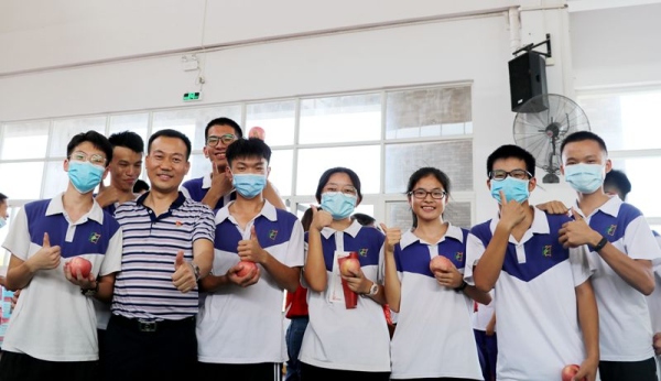 陳清茂校長帶領學校領導班子和全體老師,為初三年級每位同學送去一份“特別禮物”——紅彤彤的大蘋果。希望同學們吃大蘋果,取得好結果,也希望同學們順其自然、輕松平和赴考,永寧中學2020屆紅紅火火、碩果累累。