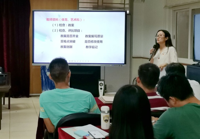 龍主任從四個方面強調了本學期教學常規管理要求和教研紀律。一是加強教師隊伍建設,主要從骨干教師引領、科組長備課組長管理、青年教師培養、新教師到崗培訓等方面進行。二是加強課堂教學研究。明確各科組、各備課組以“分層教學”為教研主題,要求各備課組要大力改進學案,在學案的設計、課堂教學環節中明確體現分層,初一小步子嘗試走班教學,初二初三開展AB班輔導教學,由固定教師有計劃有策略進行培優。