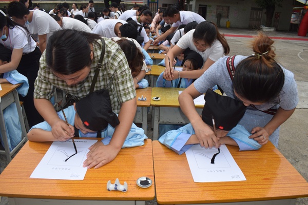 本次“開筆禮”儀式包括:正衣冠、禮拜先師、敬謝父母、敬拜師長、朱砂啟智、書字明理、擊鼓鳴志、經典立志等多個環節。