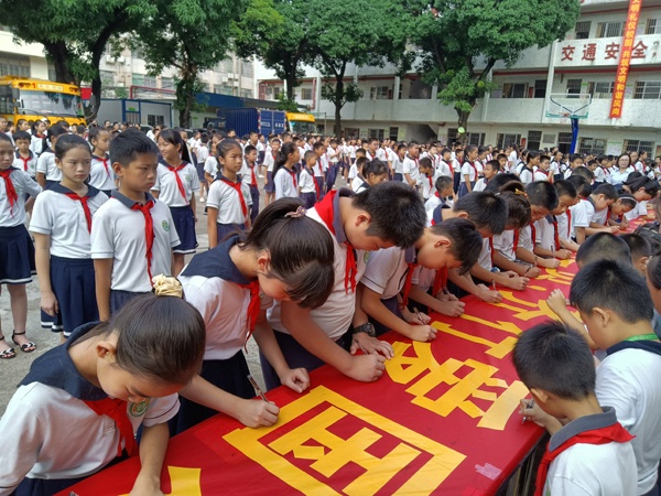 上午8時,伴隨著進場音樂,各班隊伍邁著整齊的步伐進入會場,同學們精神煥發,神采奕奕,列隊整齊。主持人開場后,舉行了升旗儀式,全體師生齊唱國歌。隨后,成婷校長發表了國旗下講話,她慷慨激昂,帶領全體師生共同緬懷新中國成立以來的艱辛歷程,感慨新時代美好生活的來之不易,號召師生們凝聚愛國力量,投身工作和學習中,為祖國喝彩,為夢想加油!接著,全體師生齊唱《歌唱祖國》,嘹亮的歌聲回響整個校園,同學們還深情表演了手語操《我和我的祖國》,為祖國生日獻禮。在接下來的簽名寄語環節中,師生們在愛國宣言橫幅上莊重的簽上名字,表達熱愛祖國的情懷。最后,德育處王曠主任帶領全體同學宣誓,立志發憤圖強,為偉大復興的“中國夢”而努力奮斗!