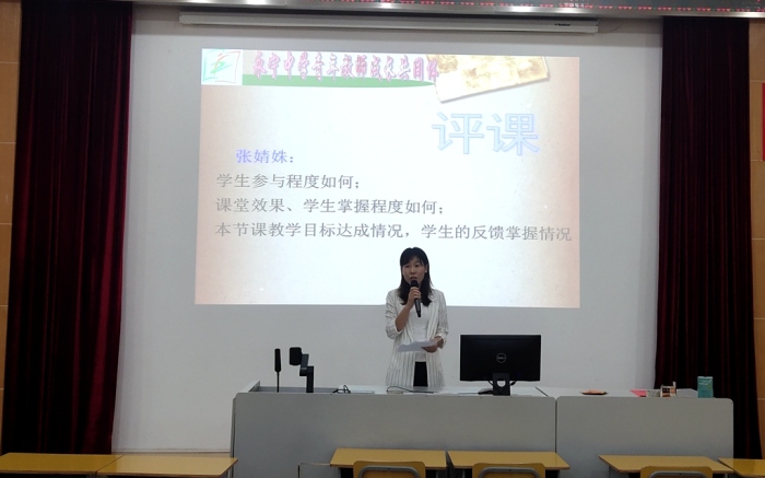 活動第二項:評課。首先,丘老師就本節課的分層教學進行了說課,詳細地從分層教學設計和分層教學實施兩大方面向大家做了詳細闡述,讓老師們對這堂課以及分層教學有了更清晰的認識。接著,語文、英語、政史地科組老師代表進行評課。語文科組張珍偉老師著重從學案分層設計的角度來闡述。英語科組侯淑芳老師則從課堂分層落實情況發表了自己的見解。她重點回答了兩方面的問題:1.如何調動學生的積極性?對不同的學生分別采取了哪些策略、方法?效果如何?2.教學過程中如何體現分層?不同層次的學生掌握得如何?政史地科組張婧姝老師則重點從以下角度進行評課:1.學生參與度如何?2.課堂效果、學生掌握程度如何?3.本節課教學目標達成情況,學生的反饋情況如何?三位老師從不同的評課視角詳細闡述了本節課分層教學的方方面面,有想法,有見地,與會的老師聚精會神,受益匪淺。