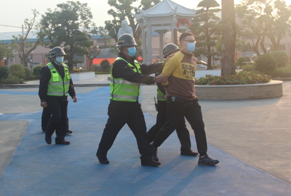 同時(shí)應(yīng)急防暴組的老師聯(lián)合門(mén)衛(wèi)迅速出動(dòng),持鋼叉、防暴盾、棍棒等防暴工具,與“暴徒”對(duì)峙周旋,讓他無(wú)法靠近師生,保證了全體師生的安全,隨后公安特警趕來(lái)將“暴徒”制服。至此,警報(bào)解除。