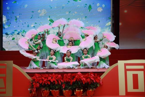 在歌聲中,在歡呼聲中,全體嘉賓在學校領導的陪同下,與演員代表一起走上舞臺,一起鼓掌,一起歡歌。彩帶在空中飛揚,紅旗在臺下翻飛,到處都是歡樂的海洋!