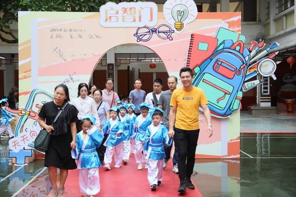 上午9點,伴隨著熱烈的掌聲,一年級的家長代表牽著孩子們的手,踏上了象征著希望、活力、健康、幸福的紅地毯,走過七彩啟智門,加入了滘口小學這個有愛的大家庭。“啟智門”寓意開啟智慧之門,孩子們將從這里跨出人生的第一步,去思考,去探索,向著更高更遠的方向邁進。他們正式成為一名光榮的小學生了!這一刻,孩子們笑靨如花,快樂洋溢在臉龐,自信從眉宇間飛揚,幸福與驕傲在心底流淌……