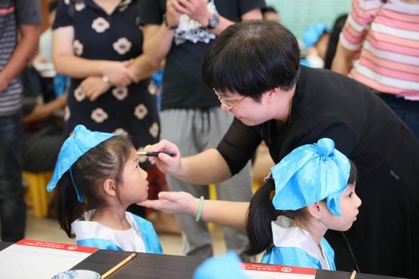 額點朱砂啟智慧——陣陣古琴曲聲中,家長、老師們擎起朱砂筆,師生攜手啟迪智慧, 輕輕一點,一個個鮮紅的圓點印記在孩子稚嫩的額頭上,多么明亮,多么鮮艷。