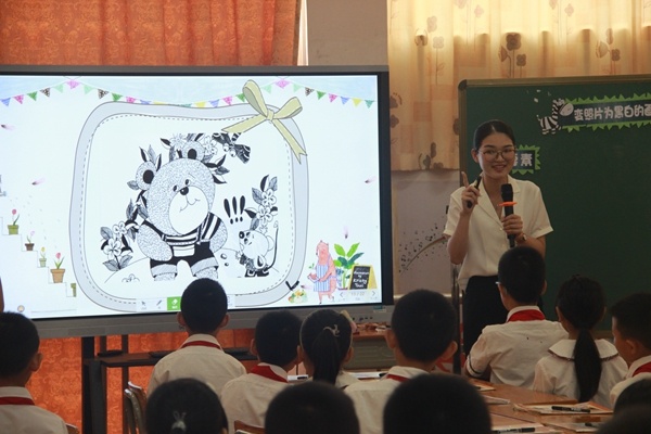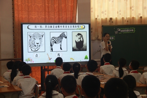 劉榕老師執教的四年級美術課《變照片為黑白的畫》, 以動物王國的故事為主線導入,逐步過渡到彩色照片如何“變”為黑白畫的一個教學過程。在這節課,劉榕老師熟練使用希沃白板的各種功能,將信息技術巧妙的運用到美術教學中,再加上劉老師的教學基本功扎實、語言表達生動、可親,讓學生在新奇、生動、活潑的氛圍中學習。最后作品完美的展示了這節課的效果。