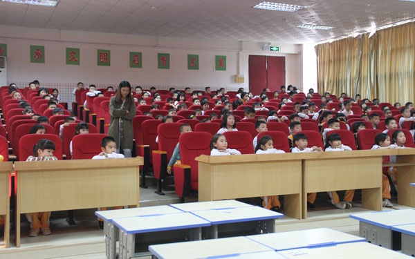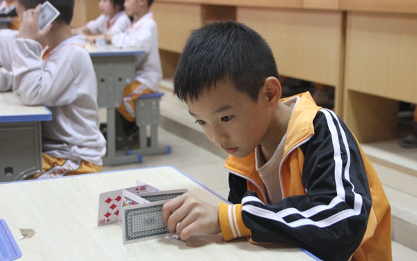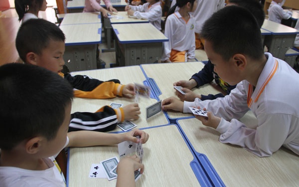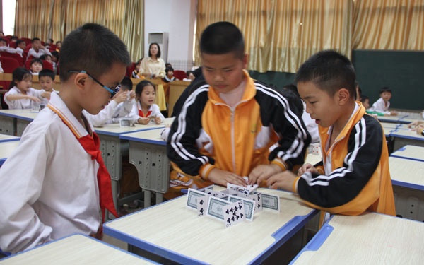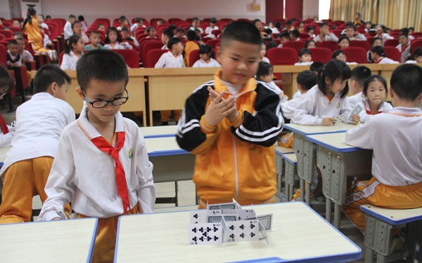 各參賽隊伍在了解比賽規則了之后,比賽就開始了。一年級的小朋友們各施其技,搭出各種各樣形狀的紙牌,然后再小心翼翼地把書本放在搭好的紙牌上。但是有些隊伍在放書本的時候,不小心把搭好的紙牌推到了,必須要從頭再來,可小朋友們也沒有氣餒,更是同心協力地繼續比賽。而看臺的同學則屏住呼吸,生怕發出一點點聲音就會讓賽場上的紙牌倒掉。比賽的最后,一(2)班的C組參賽隊伍以在紙牌上放上了18本書的成績勝出比賽。
