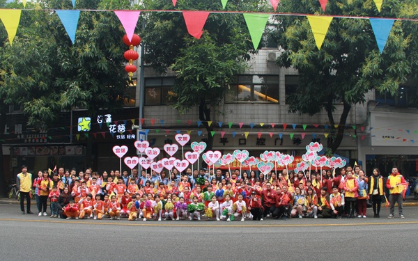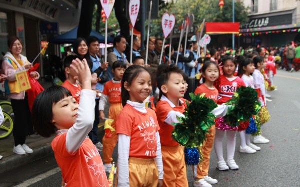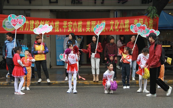 早上8點左右,聯豐小學參加萬人行助慶活動的師生和家長義工們就來到了助慶點:升平西路升平牙科所門前。他們迎著寒風布置場地,整理隊伍。9點前,家長義工和老師們給小演員做了簡單的化妝,把橫額掛好,安排好家長義工和小演員的位置等。幾位訓練老師指導學生開始熱身運動和練習,一切整裝待發。9:30在游行隊伍來到之前,小演員脫下厚厚的大衣,開始跳躍運動來讓身體暖和。從9:40左右迎來了第一個游行方隊,到11:40迎來最后一個方隊,小演員們跳啦啦操的熱情從未減退過,他們矯健的舞姿,響亮的口號,燦爛的笑容給游行的隊伍留下了深刻的印象,不少游行人員隨手拿出手機給他們拍照,留住這動人的一刻,美麗的瞬間。站在后排的家長義工和老師們也不遜色,他們高舉宣傳標語,揮動手中的小旗幟,給游行隊伍鼓氣,也給這可愛的小演員們鼓勵。
