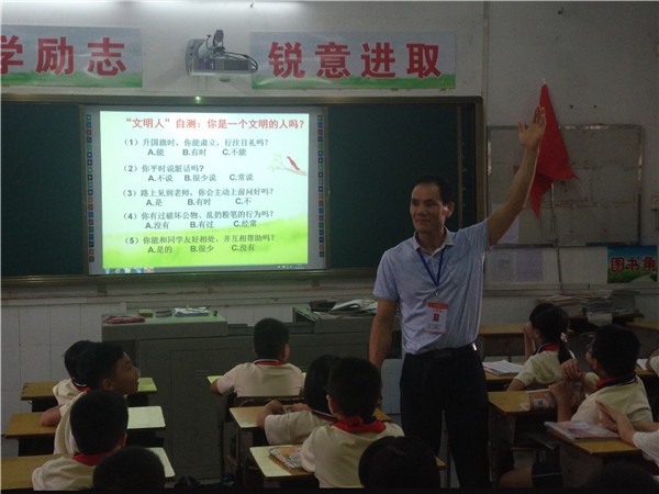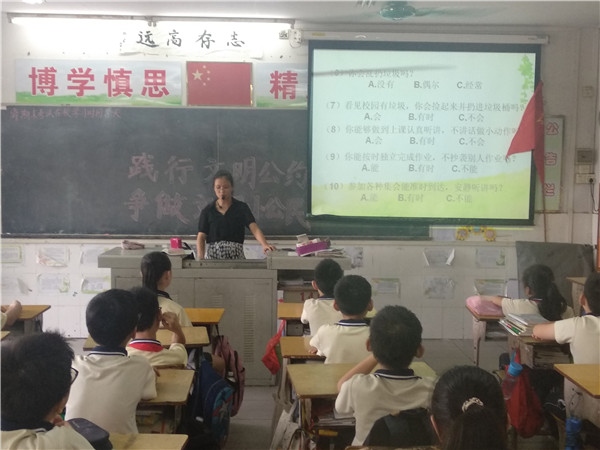 活動中,各班利用班會時間,組織學生開展“踐行文明公約 爭做文明小學生”主題班會教育活動,主題班會從“文明故事入手”引導學生懂得文明禮儀的重要性。接著,列舉了學生身邊的經常碰到的行為讓學生對照自身表現對自己做出一個中肯的選擇。通過這個環節學生更清晰地認識自我,每位學生自我剖析自己,找出自己的不良習慣,寫出自己改正不良習慣的打算,請同學和老師進行監督。最后,班會課還通過圖文并茂的漫畫、身邊的個案進一步詮釋文明行為的重要性,讓學生深受教育,并在國旗下宣誓:向不文明現象宣戰,爭做文明學生,創建文明校園!
