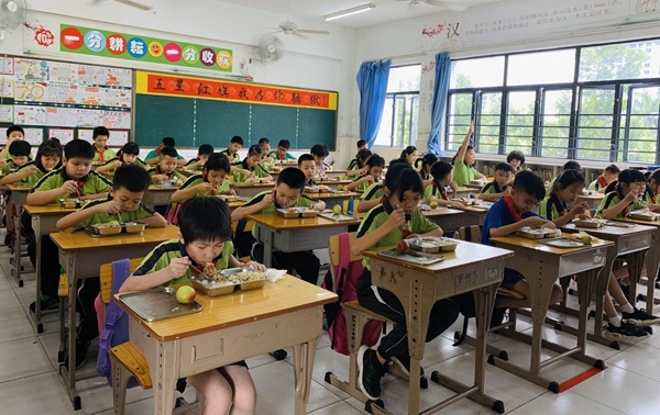 “食無語,食無余”。午餐時間到,食堂工作人員提前把午餐打包好,運送到各班的課室門口。學子們在班主任的帶領下,做好就餐前的各項準備。分批洗手、錯峰排隊領餐盤、在教室吃飯,一切有條不紊的進行,學子們享受著午餐的愉快時光。用餐后,學子們有序的清理好桌面,班主任有序的給孩子進行體溫測量,安靜午睡。