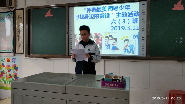接著,各班將“評選最美南粵少年”主題活動與弘揚雷鋒精神活動結合起來,讓本班的最美南粵少年進行演講,號召同學們“尋找身邊的雷鋒”。他們用富有感染力的語言,激發了同學們學習雷鋒的熱情,讓同學們明白——學雷鋒不是為了得到表揚,而是在盡自己所能去幫助他人,去創建一個和諧溫暖的生活環境。