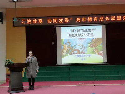 德育交流活動在豐華學校本次活動主持人向彪老師的組織下,拉開了帷幕。活動流程有三個環節:第一環節是由榮獲中山市特色班級,豐華學校的五(2)墨梅小筑班、二(1)彩虹班及盛豐小學二(4)昆蟲世界班進行創建交流。盛豐小學的金玉老師有條理地從班級文化創建思路、具體發展措施和總預期效果三個方面對二(4)班“昆蟲世界”特色班級文化的創建理念和創建過程進行匯報。