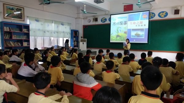 五(3)班展示的主題是“珍惜水資源”。陳嘉鈴同學分享了讀《水的故事》的心得體會。徐傲翔同學分享了讀《神奇校車之水的故事》的閱讀心得。何俊志同學現場給大家做了一個《縱橫交錯的管道》的小實驗,讓同學們認識到保護水資源的重要性。