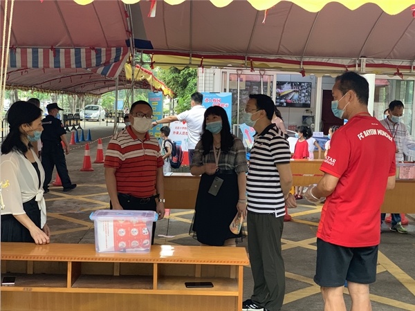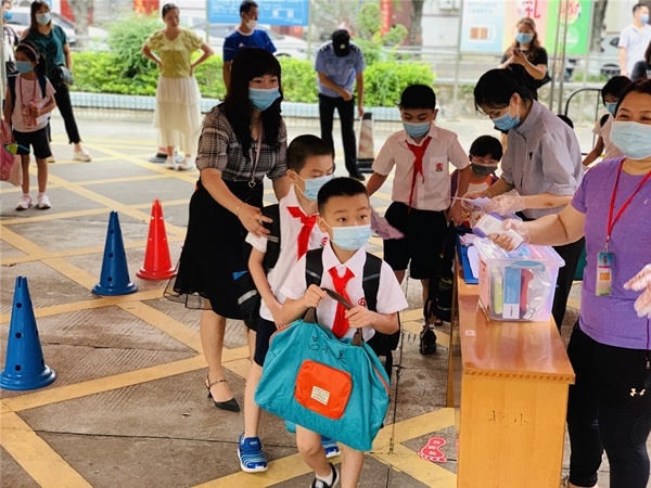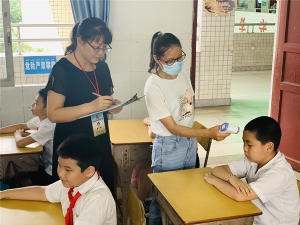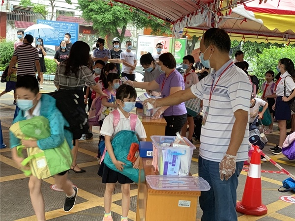 通往校園的河涌路上,孩子們按照學校制定的上學時間,實行錯峰上學。越靠近北區小學的遮雨棚,越看清排隊的孩子們一臉認真,聽從現場值日老師的引導,快速進入校園!今天是一、二和三年級返校復課的第二天,經過昨天的校園生活,低年級孩子們已經了解上學的秩序,學校的行政班子依然不懈怠地早早在校門口做好迎接全校學生上學的準備,即使是已經熟悉的測量體溫工作,值日老師們都一絲不茍地對待,面對全校學生錯峰進入校園,壓力不可小視,這種認真對待的態度是北小一貫的常態!