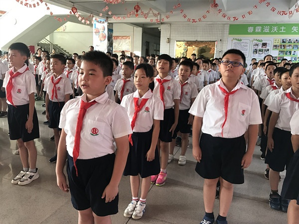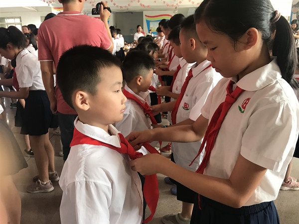 各班級以年級為單位整隊報數后是新隊員的入隊儀式,北區小學二、三年級一共84名新隊員光榮地加入少先隊,在歡快的歌聲中,高年級的大哥哥大姐姐莊嚴地為新隊員佩戴上鮮艷的紅領巾,全體新隊員在大隊副輔導員朱美桃老師的帶領下莊嚴宣誓,為共產主義事業貢獻力量,二(1)班新隊員代表楊燁婷同學代表全體新隊員表心志,五(3)班老隊員代表黃綺夢同學向新隊員提出倡議和希望。