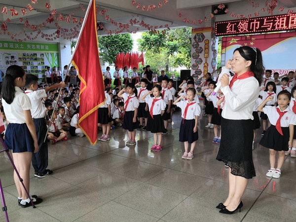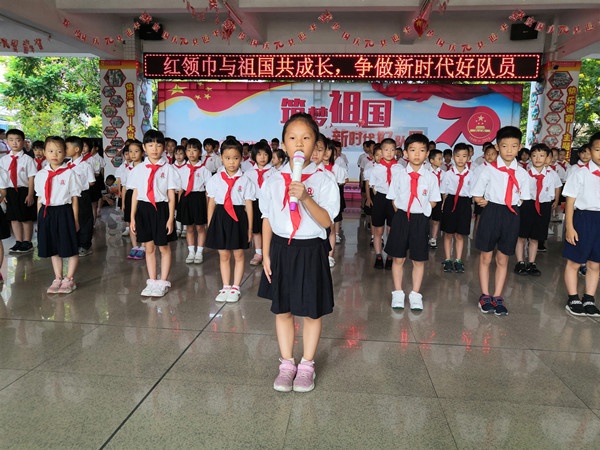 為慶祝中華人民共和國成立70周年,慶祝中國少年先鋒隊建隊70周年,喜迎少先隊廣東省第七次代表大會的召開,教育引導廣大少先隊員聽黨的話、跟黨走,用實際行動弘揚愛國主義精神,把紅色基因一代代傳下去,增強少先隊員光榮感,落實“立德樹人”的教育根本目標,北區小學少先隊組織開展主題為“紅領巾與祖國共成長,爭做新時代好隊員”的主題建隊日大隊活動。