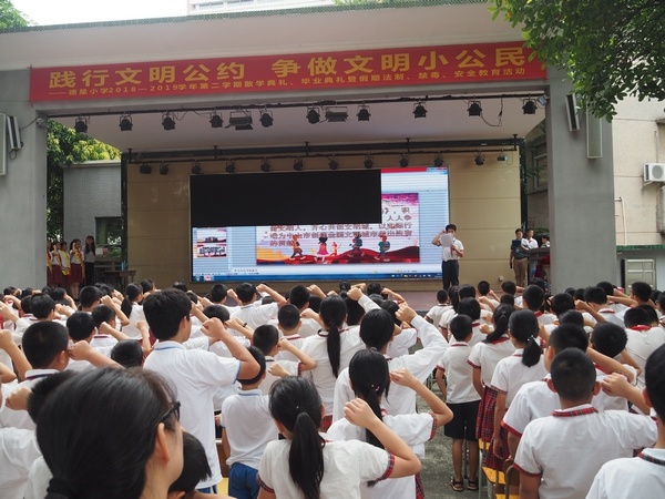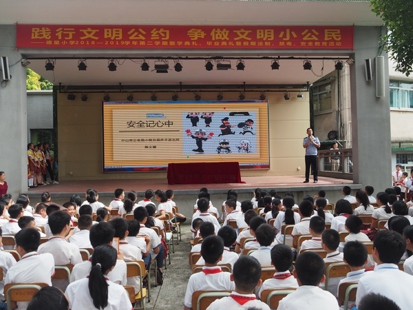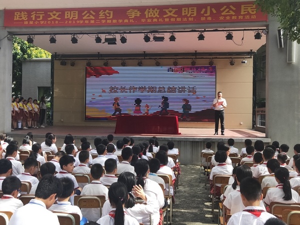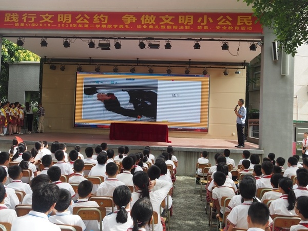 為大力培育和踐行社會主義核心價值觀,深化全國文明城市和文明校園創建,中山市教育和體育局在中小學生中組織開展《中山市民文明公約》宣傳教育實踐活動,通過“小手拉大手,文明齊步走”的方式,促使廣大市民對文明公約普遍認知認同,做到內化于心、外化于行,進一步提升社會文明程度。2019年7月5日德星小學開展了“踐行文明公約,爭做文明小公民”主題教育活動暨散學典禮、畢業典禮、假期法制、禁毒安全教育活動。