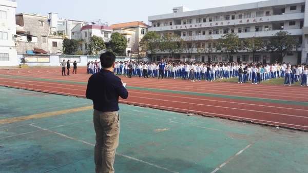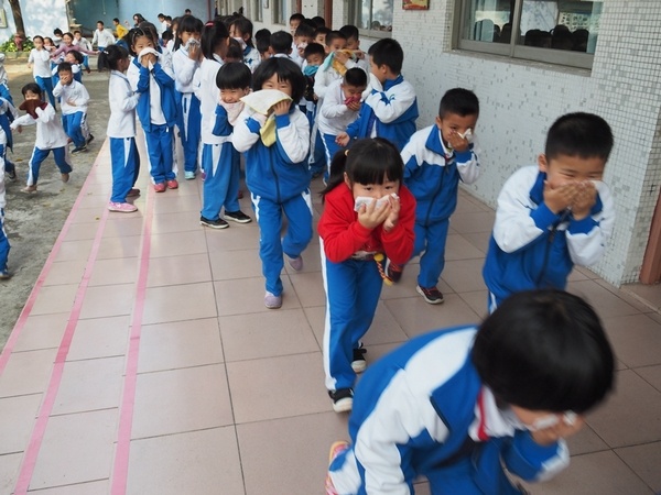 為確保本次演練到位,學校專門召開了消防疏散演練工作人員會議,確保演練能安全、成功地開展。15:55,隨著警報聲的響起,各班正副班主任第一時間起到本班的教室,馬上組織學生撤離;學校安全員也在第一時間趕到指定位置,協助學生快速、有序地撤離。各班班主任和任課老師帶領本班學生彎著腰,用濕毛巾捂住鼻口,沿指定路線迅速撤離至安全地帶。隨即,各班班主任清點學生人數,確保學生無一人滯留,并向副總指揮匯報情況。本次參與演練的學生有963人,教師及后勤人員共58人,學校全部師生安全撤離只用了1分58秒。