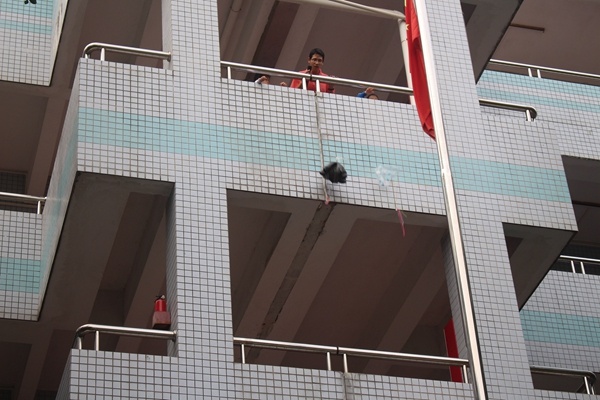 評(píng)委老師和工作人員也在樓下的場(chǎng)地上,緊張地忙碌著:有的記錄降落傘下降所用的時(shí)間;有的忙著給降落傘拍照;還有的在幫忙撿起掉下來(lái)的降落傘……校園里洋溢著緊張有序的氣氛,在萬(wàn)眾矚目下,緊張的比賽終于結(jié)束了。評(píng)委老師很快算好比賽成績(jī)并進(jìn)行了評(píng)獎(jiǎng)。