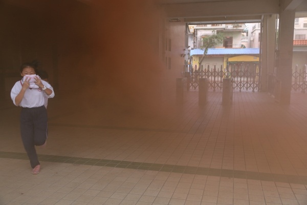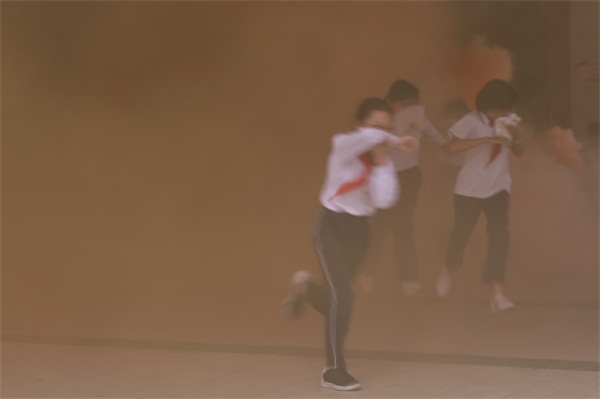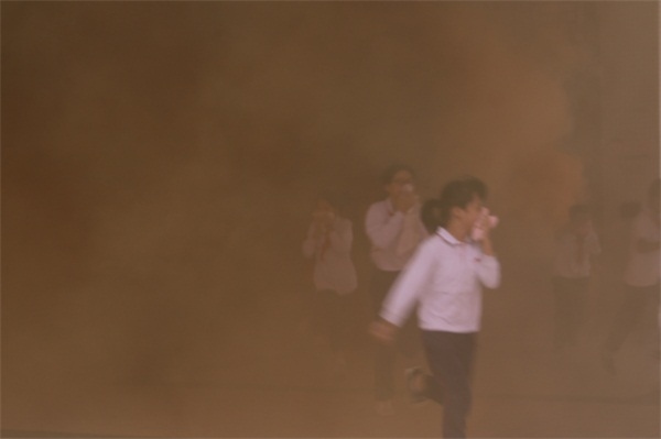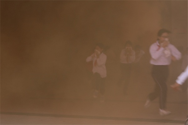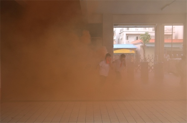 為保證活動地順利進(jìn)行,學(xué)校提前告知孩子們當(dāng)天準(zhǔn)備好毛巾,但為了提高學(xué)生的應(yīng)急能力不告訴學(xué)生具體的演練時間。警報一鳴起,全體學(xué)生迅速用毛巾捂住口鼻,快速地按學(xué)校指定的疏散路線撤離教學(xué)樓,集中到運(yùn)動場。為了讓師生真實體驗此過程,本次還在各個逃生必經(jīng)之處點燃了煙霧彈,現(xiàn)場濃煙滾滾,效果逼真。隨后,吳主任點評了本次消防安全演練。吳主任向同學(xué)們講解了一些逃生知識要點,特別是要用濕布捂住口鼻,有利防止被煙霧熏倒而導(dǎo)致喪失生命。