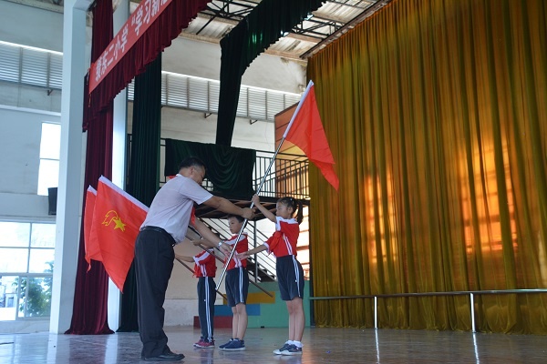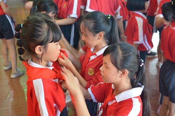 宣誓完成后,大隊輔導員為一年級三個新建中隊授旗,陳凱訊副校長和三位隊員給一年級新建中隊的三位輔導員佩戴紅領巾以及頒發聘書。大隊輔導員還用熱情洋溢的講話激勵“小紅領巾們”做好榜樣,發揮先鋒作用,為鮮艷的紅領巾增添光彩。最后,大隊輔導員帶領著全校少先隊員們呼號,全體少先隊員們高聲回應著:“時刻準備著!”