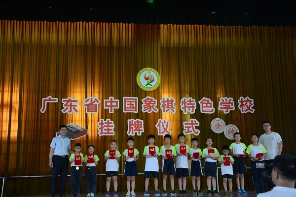 接著,小欖鎮(zhèn)象棋協(xié)會會長、績東二社區(qū)居黨委副書記兼居委會主任張全輝先生發(fā)言:他對學校取得的象棋方面的成績非常滿意,也表達了將一如既往的給學校支持和寄予厚望取得更好成績。接下來是給獲得省市個人冠軍或團體冠軍的學生進行隆重的頒獎。然后進行 “廣東省象棋特色學?!闭浇遗啤W校的棋隊12人還與國家大師黃仕清先生進行車輪戰(zhàn),“棋”意蕩漾在整個體育館。