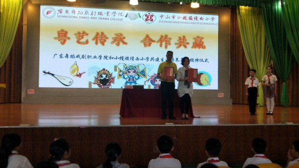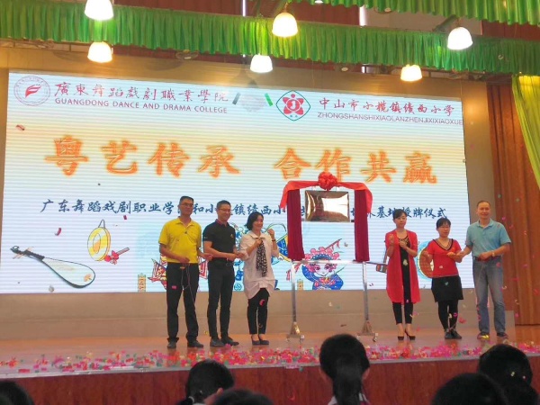 然后,廣東舞蹈戲劇職業學院黃燕書記和績西小學何桂雄校長簽訂了合作培養生源協議。隨后盧穎禧局長、趙宇科長、李藝老師、蘇學成先生、楊麗材女士、何桂雄校長一起舉行廣東舞蹈戲劇職業學院生源培養基地揭牌儀式。