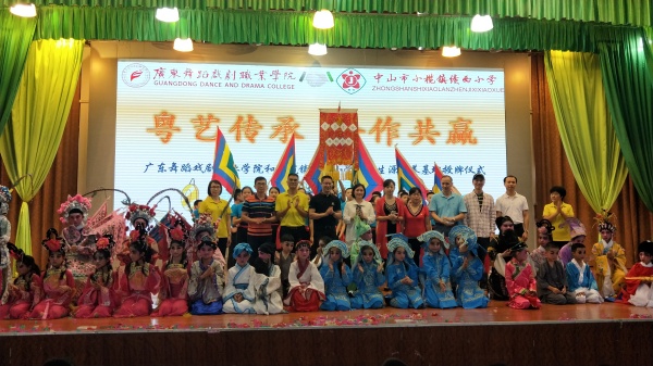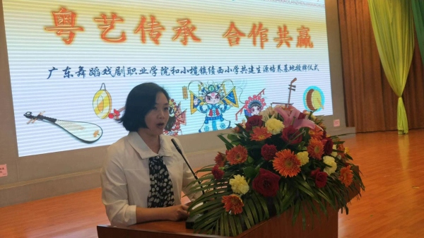 接著,廣東舞蹈戲劇職業學院戲劇系支部書記、副主任黃燕女士致辭,她對績西小學多年來在戲曲教育發展方面取得的成績表示充分的肯定和贊許。她代表學院衷心希望與績西小學實現資源共享、共同發展,雙方進行全方位合作,發揮兩校各自優勢,全面交流合作,并為以后在戲曲項目發展領域上的合作建立一個堅實基礎,努力擴大雙方合作的深度和廣度,實現互利共贏,進一步普及培訓師資及人才培養,爭取人力資源開發,增強動力,為培養高素質的粵劇人才添磚加瓦,為粵劇這一嶺南瑰寶煥發青春活力,代代相傳。
