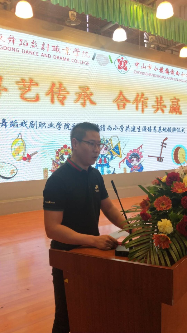 首先由小欖鎮文體教育局局長盧穎禧先生致辭,他充分肯定了績西小學在何桂雄校長的帶領下,秉承“人人有素養,個個有特長”的辦學理念,堅定走綜合素養特色發展之路,十年來學校堅持開展戲曲進校園活動,全校師生掀起唱粵曲演粵劇熱潮,在市級粵曲課題引領下,成立了“南國小紅豆曲藝社團”和家長粵曲協會,“南國小紅豆曲藝社團”榮獲中山市優秀藝術社團稱號。所排練節目先后參加國家、省、市、鎮各級比賽表演30多場次,五十多人次獲得金獎,碩果累累。楊卓琳、廖凱文、麥曉君、張偉儀、楊倫杰、何凱潮、陳櫻尹七位同學通過考試被廣東省舞蹈戲劇職業學院錄取。學校粵曲粵劇教學成效顯著,形成了鮮明的藝術教育特色,曲藝教學早已成為學校一張靚麗的名片,受到市內外廣泛關注。今天廣東舞蹈戲劇職業學院生源培養基地在績西小學校授牌,希望績西小學打造成為戲曲人才培養的搖籃,以生源培養基地授牌為鍥機,依托名校,優化資源,努力提升戲曲教育教學水平,為社會輸送更多品學兼優的高素質人才。