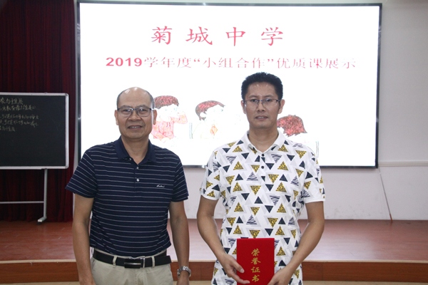 菊城中學(xué)“小組合作學(xué)習(xí)”改革的領(lǐng)頭人——王會成老師展示了一節(jié)精彩的優(yōu)質(zhì)課。課堂上,王老師嫻熟運用多種教學(xué)手段,有師徒合作、小組研討、學(xué)生展示,充分調(diào)動學(xué)生的學(xué)習(xí)熱情,激活學(xué)生的思維,深入淺出,讓不同層次的學(xué)生都能掌握知識,真正實現(xiàn)了小組合作學(xué)習(xí)的高能效應(yīng)。整堂課如行云流水,師生的默契、學(xué)生的優(yōu)質(zhì)展示,非一朝一夕可以生成,都是王老師平時教學(xué)傾心傾情的結(jié)果。課后,曾文春副主任作了精彩的點評,對王老師堅持不懈、樂于探索、敬業(yè)愛業(yè)的精神點贊!王永月校長給王老師頒發(fā)了證書,對王老師在小組合作改革方面給予學(xué)校老師的引領(lǐng)和作出的貢獻表示衷心的感謝和由衷的敬意。